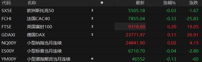 周二盘前,美股三大股指期货震荡盘整,欧洲主要指数涨跌不一。截至发稿,纳斯达克100指数期货涨0.02%,标普500指数期货跌0.04%,道指期货跌0.13%。